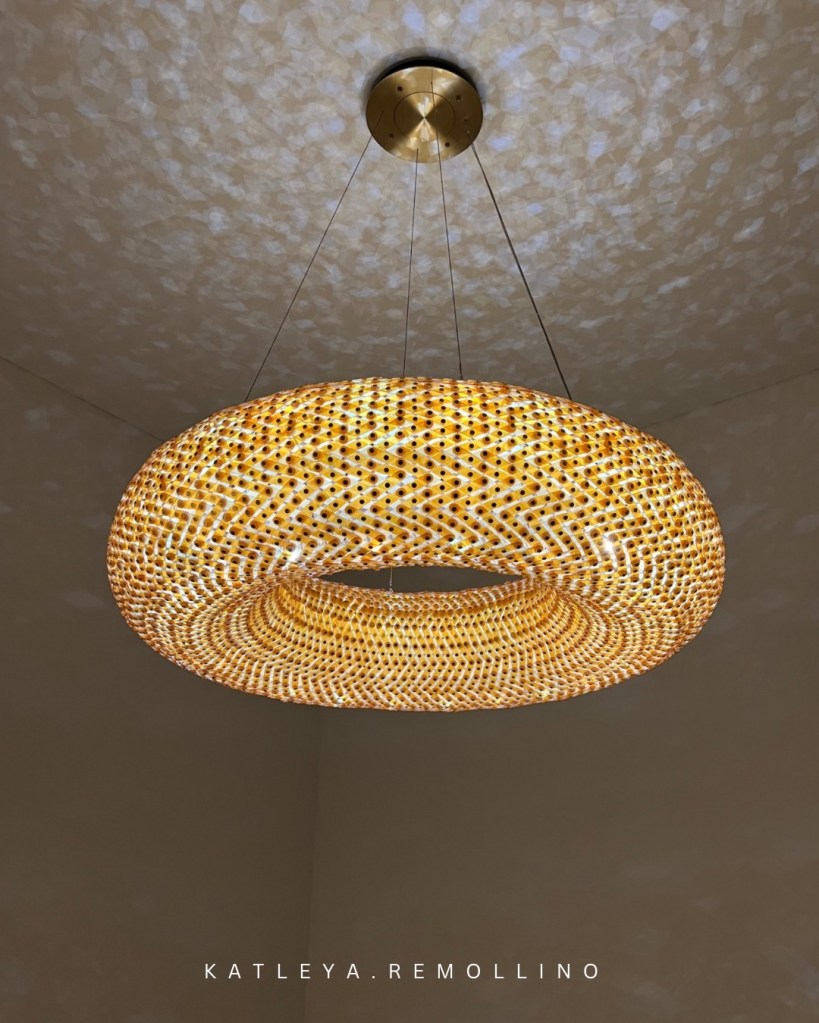 Murano glass mesh, brass, stainless steel, cables and LED light fittings.